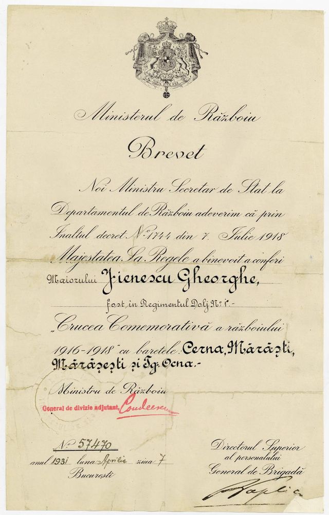 ✈️𝐙𝐢𝐮𝐚 𝐌𝐨𝐧𝐝𝐢𝐚𝐥𝐚̆ 𝐚 𝐀𝐯𝐢𝐚𝐭̦𝐢𝐞𝐢 𝐬̦𝐢 𝐚 𝐂𝐨𝐬𝐦𝐨𝐧𝐚𝐮𝐭𝐢𝐜𝐢𝐢 Cu prilejul acestei zilei, vă propunem să vă delectați cu un brevet emis de Ministerul de Război, prin care maiorul Gheorghe Jienescu primește decorația “Crucea Comemorativă a războiului 1916-1918”, cu baretele Cerna, Mărăști, Mărășești și Tg. Ocna. Gheorghe Jienescu (1894-1971) a fost un pilot român, general de aviație și subsecretar de stat în Ministerul Apărării Naționale pentru Aer și Marină (1941-1944). Ziua Mondială a Aviației și a Cosmonauticii este celebrată anul la data de 12 aprilie după ce, în anul 1961, pilotul și cosmonautul sovietic Iuri Gagarin a devenit primul om care a ajuns în spațiu. 🔗http://clasate.cimec.ro/Detaliu.asp… 📷Brevet de decorație, Muzeul Național de Istorie a României – BUCUREȘTI, 7 aprilie 1931 #patrimoniu #patrimoniumobil #patrimoniucultural #culturalheritage #ziuaaviației