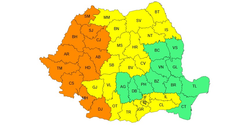 Administrația Națională de Meteorologie a emis avertizări de caniculă pentru două zone din țară, un cod portocaliu pentru vestul țării și un cod galben pentru nordul, centrul și sudul țării. Atenționările sunt valabile pentru astăzi și mâine.
