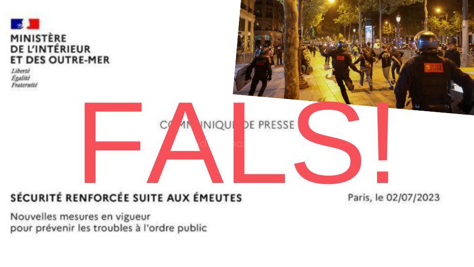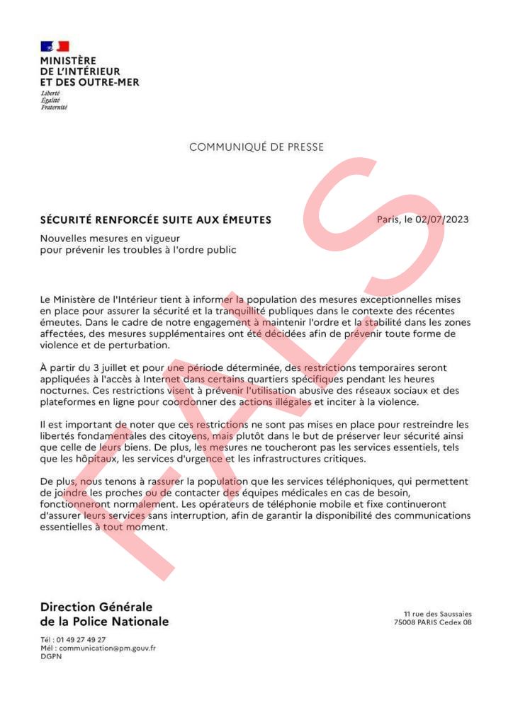 După seria de revolte recente care au avut loc pe teritoriul francez, unde protestatarii, cu o medie de vârstă de 17 ani, au vandalizat magazine, incendiat instituții publice, ars sute de mașini, tăiat stâlpii cu camere de securitate și cablurile de internet din fibră optică, ceea ce a dus la lipsa internetului în unele zone, a apărut acum pe internet un comunicat fals atribuit Ministerului de Interne Francez.