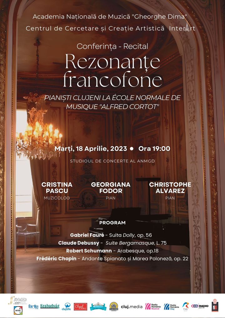 CONEXIUNI ÎN COMUNITATE Regal artistic de pian la Academia de Muzică „Gheorghe Dima” din Cluj-Napoca Centrul de Cercetare şi Creaţie Artistică Interart Pe data de 10 Martie 2023, Institutul de Istorie „George Bariţiu” din Cluj-Napoca al Academiei Române a semnat un parteneriat oficial de colaborare, pe durată lungă, cu Academia de Muzică „Gheorghe Dima” din Cluj-Napoca, o instituţie centenară de mare prestigiu în comunitatea locală, naţională şi internaţională. Ne-a angajat atunci că vom colabora strâns pentru derularea unor proiecte editoriale, mese rotunde în cadrul Zilelor Academice Clujene şi nu numai, lansări de carte, evenimente culturale şi academice comune etc. Un asemenea eveniment cultural, în fapt un Regal Artistic de Pian, va avea loc în ziua de Marţi, 18 Aprilie 2023, ora 19, la Studioul de Concerte al Academiei de Muzică „Gheorghe Dima” din Cluj-Napoca. Colegii şi prietenii noştri de la Centrul de Cercetare şi Creaţie Artistică Interart ne invită la Conferinţa-Recital: “Rezonanţe fracofone. Pianişti clujeni la École Normale de Musique „Alfred Cortot”. Prezintă: Dr. Cristina Pascu – Muzicolog Georgiana Fodor – Pian Christophe Alvarez – Pian Mult succes colegilor şi prietenilor noştri de la Centrul de Cercetare şi Creaţie Artistică Interart al Academiei de Muzică „Gheorghe Dima” din Cluj-Napoca. Vom fi alături de ei!