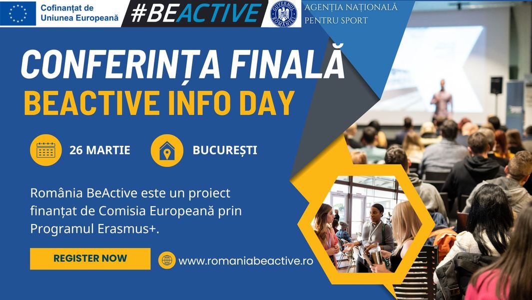 Conferința finală a proiectului „România BeActive” este un eveniment important ce va avea loc pe 26 martie în București. Organizatorii sunt Agenția Națională pentru Sport, Agenția Națională pentru Programe Comunitare în Domeniul Educației și Formării Profesionale și Institutul Național de Cercetare pentru Sport.