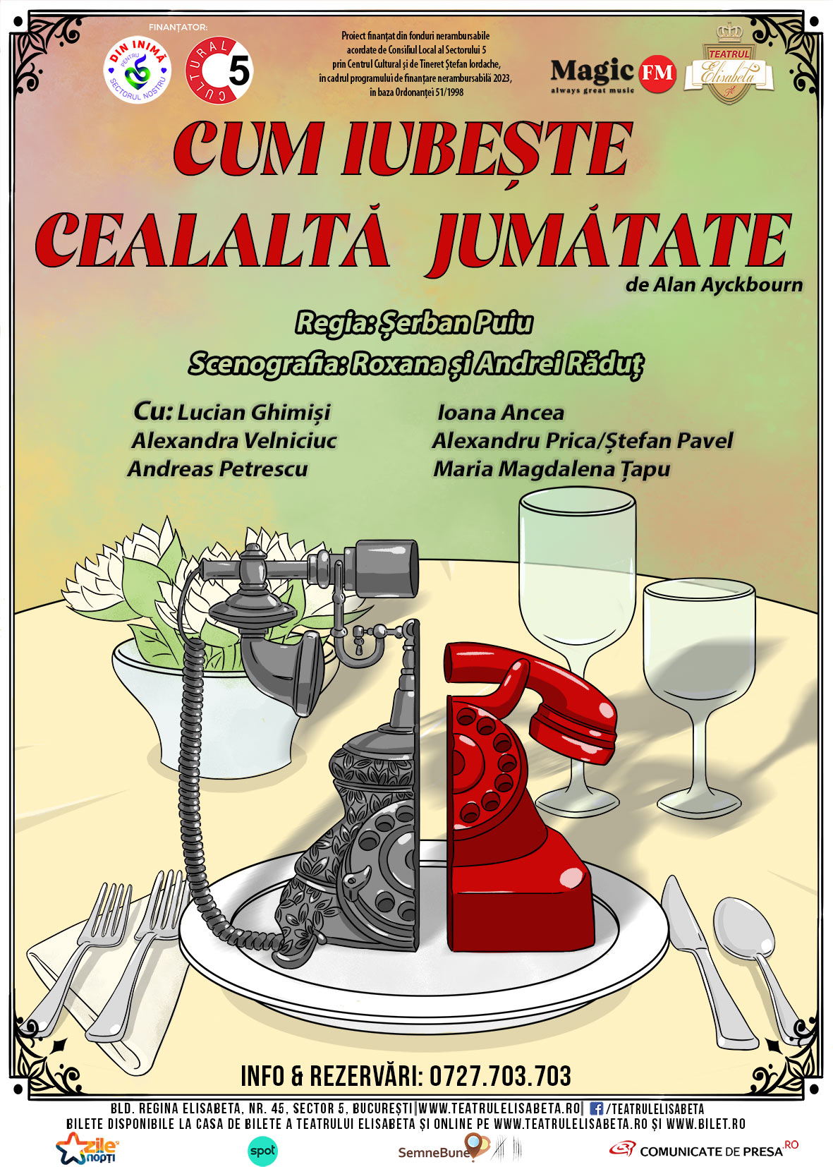 Marţi, 5 decembrie, începând cu ora 19:00, va avea loc premiera comediei „Cum iubește cealaltă jumătate”, în regia lui Șerban Puiu, la Teatrul Elisabeta. Proiectul este finanţat din fonduri nerambursabile din bugetul local al Sectorului 5 al Municipiului Bucureşti, prin Centrul Cultural şi de Tineret „Ştefan Iordache”. Locuitorii Sectorului 5 vor avea acces gratuit la reprezentaţiile din 5, 6 și 7 decembrie.
