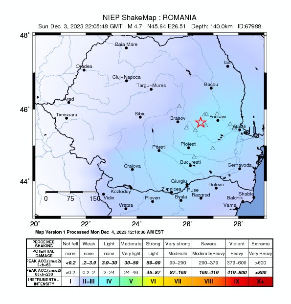 În ziua de 04.12.2023, 00:05:48 (ora României), s-a produs în ZONA SEISMICA VRANCEA, BUZAU un cutremur mediu cu magnitudinea ML 4.7, la adâncimea de 140 km.
