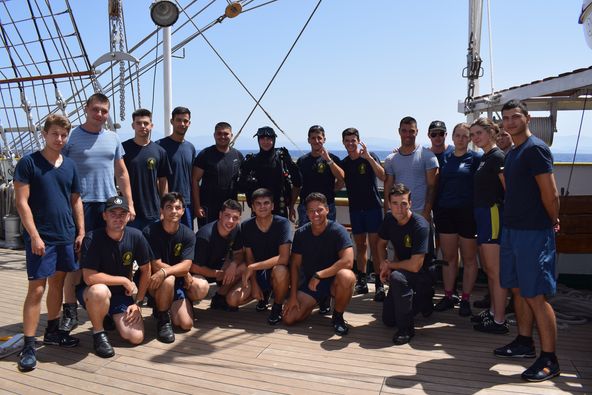 După masa de dimineață, programul zilnic al cadeților continuă cu o nouă sesiune de antrenament cu bărcile 10+1, urmată de un mic exercițiu de abandon al navei, care dă șansa echipajului să se răcorească în apa de o limpezime perfectă a Mării Ionice.