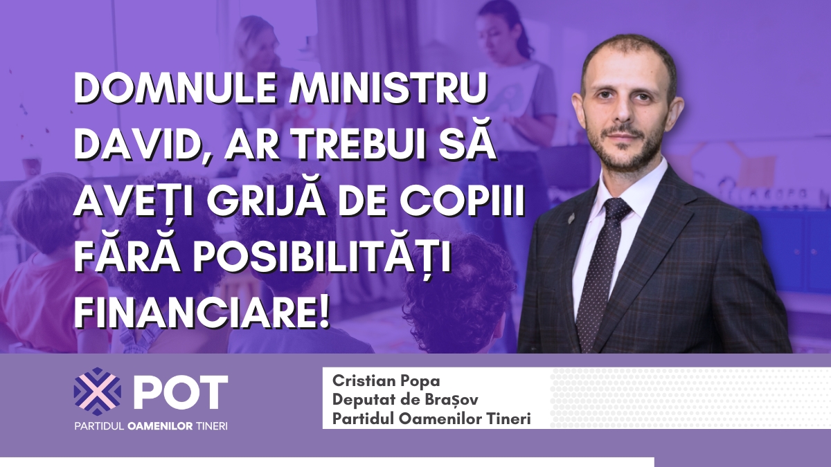 Deputatul POT de Brașov, Cristian Popa, transmite o scrisoare deschisă Ministrului Educației, Daniel David, prin care solicită explicații privind întârzierile la virarea sumelor pe cardurile sociale educaționale destinate elevilor care au nevoie de sprijin financiar. POT cere prelungirea termenului de achiziție a rechizitelor.