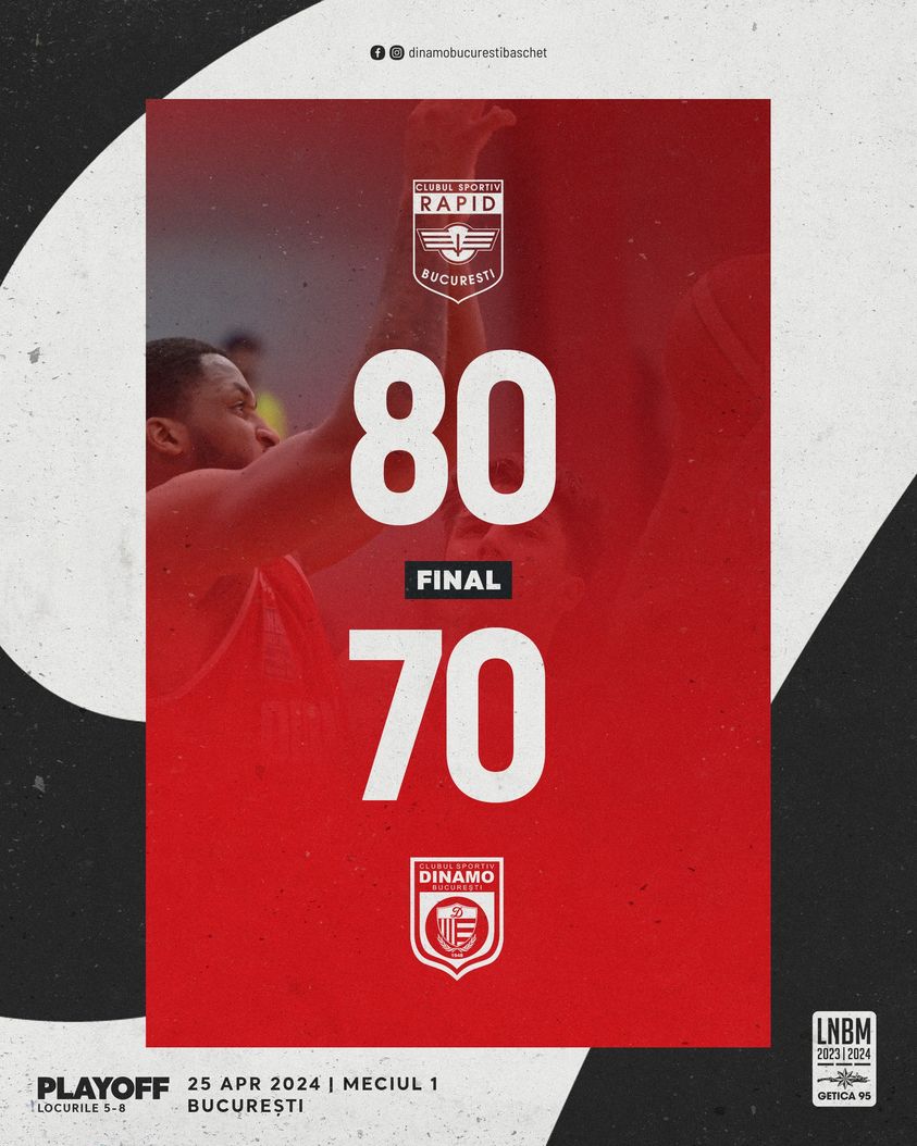 Echipa de baschet Dinamo București a avut parte de o confruntare strânsă în primul meci din seria locurilor 5-8 împotriva echipei Rapid. Partida s-a desfășurat fără un favorit clar în primele 30 de minute, iar diferența de 7 puncte construită de giuleșteni a fost ștearsă de alb-roșii în ultimul sfert. La finalul timpului regulamentar, scorul era egal, 66-66.