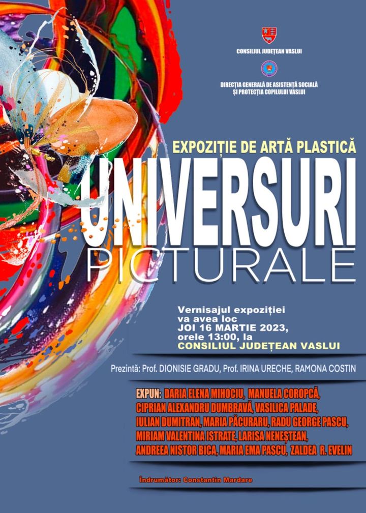 Expoziție de pictură inedită la Consiliul Județean Vaslui Joi, 16 martie, de la ora 13, în holul de la etajul 1 al Consiliului Județean Vaslui va avea loc vernisajul expoziției „Universuri picturale”. Evenimentul este organizat de Consiliul Județean Vaslui și Direcția Generală de Asistență Socială și Protecția Copilului Vaslui. Amfitrioni sunt 12 copii care provin din sistemul de protecție din Bârlad și Vaslui. Aceștia frecventează cursurile de la clubul de pictură din cadrul… Complexului „Neculai Roșca Codreanu” Bârlad. „Sunt copii talentați, care vor expune 60 de lucrări în foaierul instituției noastre. Nu sunt la prima expoziție. Aceștia și-au mai expus lucrările la Galeriile de Artă „N.N. Tonitza” din Bârlad, dar și în foaierul Senatului României. Lucrările sunt de o frumusețe aparte, iar vasluienii vor avea ocazia să vizualizeze expoziția în perioada următoare”, a declarat Dumitru Buzatu, președintele Consiliului Județean Vaslui. Despre expoziție vor vorbi profesorii Irina Ureche, Dinonisie Gradu și Ramona Costin.