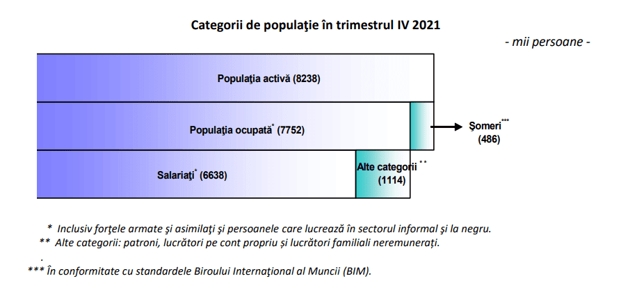 - În trimestrul IV 2021, populaţia activă a României era de 8238 mii persoane, din care, 7752 mii persoane erau ocupate şi 486 mii persoane erau şomeri.