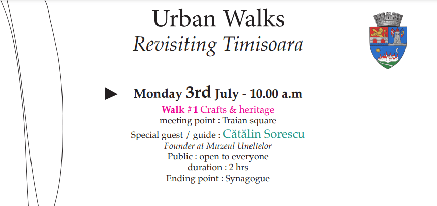 Seria de evenimente “Urban walks: Revisiting Timisoara” (n.r. Plimbări Urbane: Revizitând Timișoara) propune o abordare inedită pentru explorarea orașului. În cadrul acestor plimbări, participanții sunt invitați să experimenteze orașul ca pe un palimpsest cultural, în care trecutul și prezentul se întrepătrund într-un mod fascinant. Discuțiile și dezbaterile care au loc în timpul plimbărilor abordează forțele de reînnoire culturală, dezvoltarea contraculturilor și, totodată, oferă ocazia de a vizita atât locuri celebre, cât și locuri mai puțin cunoscute ale orașului, care reprezintă un patrimoniu al memoriei colective și al acțiunilor comunitare.