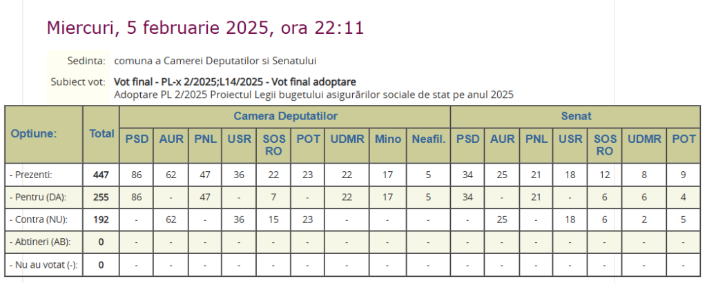 Ieri, 5 februarie 2025, a avut loc sedinta comuna a Camerei Deputatilor si Senatului, prin care s-a adoptat bugetul, mai exact s-a votat pentru adoptarea PL 2/2025 Proiectul Legii bugetului asigurărilor sociale de stat pe anul 2025.