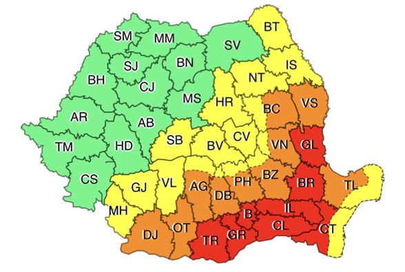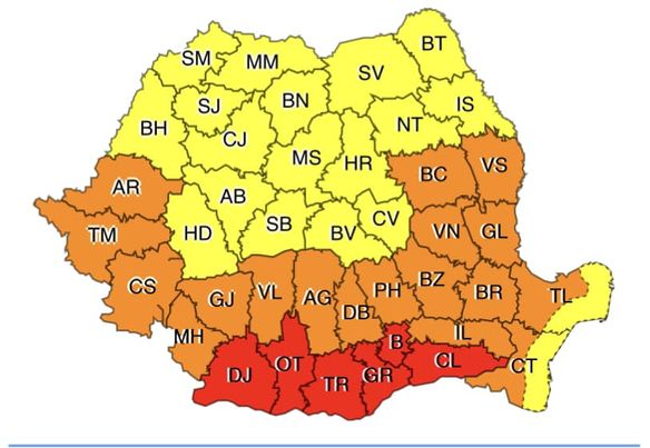 În județele Teleorman, Giurgiu, Ilfov, Călărași, Ialomița, Brăila, Galați, vestul județului Constanța și în municipiul București, se vor înregistra temperaturi maxime extreme de 40…42 de grade, iar disconfortul termic va fi deosebit de accentuat.