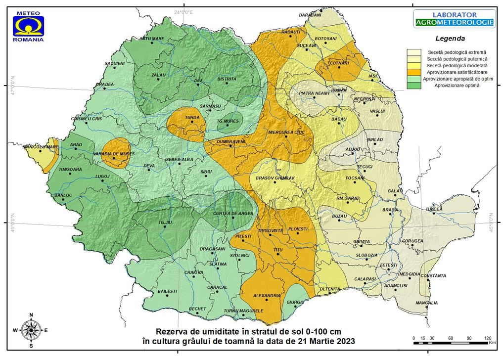 REZERVA DE UMIDITATE La data de 21 Martie 2023, în cultura grâului de toamnă, rezerva de umiditate pe profilul de sol 0-100 cm, prezintă valori satisfăcătoare, apropiate de optim și optime, în Maramureș, Crișana și Oltenia, pe suprafețe agricole extinse din Muntenia, Transilvania și Banat, izolat în estul și nord-vestul Moldovei. Deficite de umiditate în sol (secetă pedologică moderată, puternică și extremă), se înregistrează în Dobrogea, cea mai mare parte a Moldovei, local nordul, nord-estul, estul și sudul Munteniei, izolat sudul Transilvaniei și nord-vestul Banatului. SURSA: Laborator Agrometeorologie, ANM
