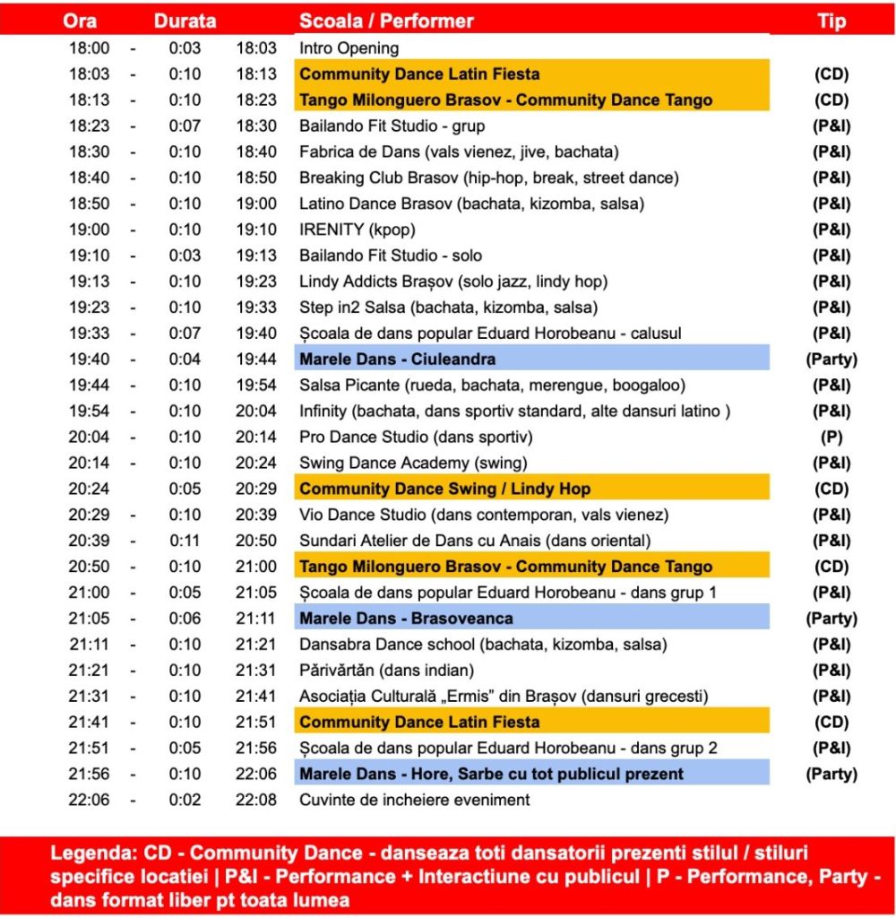 Evenimentul va reuni 18 școli și studiouri de dans din Brașov, alături de mai mult de 200 de dansatori profesioniști și amatori, toți uniți de pasiunea pentru dans. Mii de brașoveni și turiști vor avea ocazia să participe la acest spectacol unic în Piața Sfatului, ce va include peste 50 de momente de dans, printre care demonstrații de dans, flashmob-uri și dansuri ale unei întregi comunități.