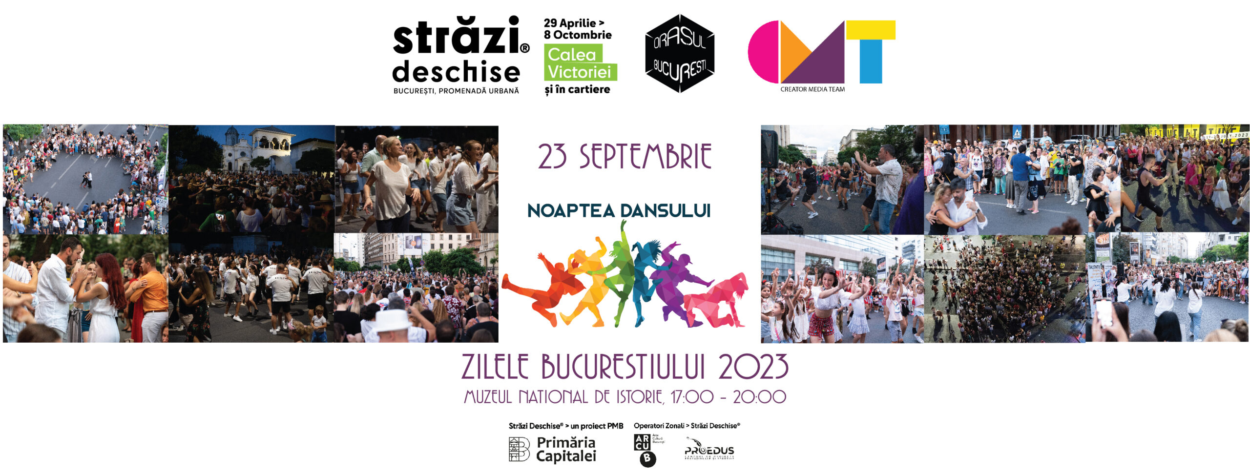 Pe 23 septembrie, ne întoarcem pe Calea Victoriei și sărbătorim Zilele Bucureștiului prin dans. Vor participa peste 200 de dansatori de la peste 15 școli de dans. Ne vom bucura impreună de peste 10 stiluri de dans și vom crea magie de ziua Bucureștiului. În zona din fața Muzeului Național de Istorie, dansatorii au pregătit momente de dans inedite, flash-mob-uri, community dance, momente de interacțiune cu trecătorii, astfel că energia și emoția se vor transmite tuturor participanților. Programul va fi disponibil în zilele următoare pe site-ul noapteadansului.ro și pe paginile de socializare (Facebook și Instagram) dedicate evenimentului – https://www.facebook.com/NoapteaDansului/.