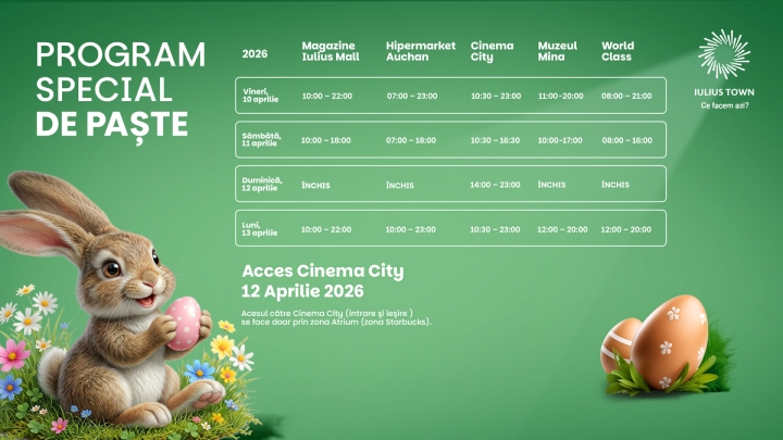 În prima zi de Paște, duminică, toate locațiile din Iulius Town vor fi închise, astfel încât clienții să se bucure de timpul petrecut acasă, alături de familie. De luni, 13 aprilie, programul revine la normal, cu magazinele deschise între orele 10 și 22, oferindu-le clienților posibilitatea de a se bucura de experiențe inedite la shopping în continuare.