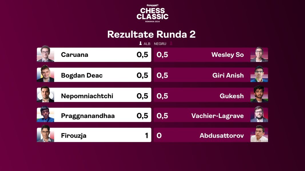 După 5 ore de șah, s-a încheiat runda a doua Superbet Chess Classic Romania cu o victorie și 4 remize. Firouzja l-a învins pe Abdusattorov, iar ceilalți jucători au făcut remize. În topul clasamentului, după cele două runde jucate, se află la egalitate Fabiano Caruana și Gukesh D.