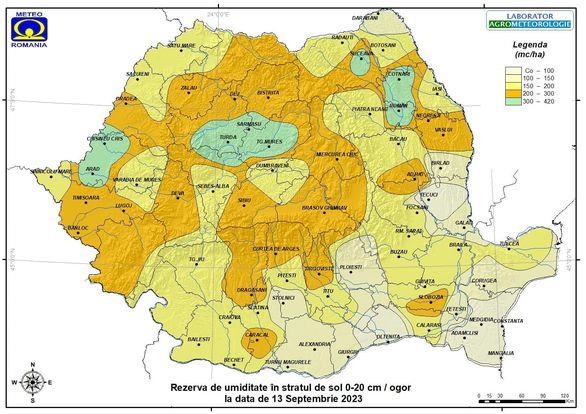 La data de 13 Septembrie 2023, conținutul de apă în stratul de sol 0-20 cm (ogor), se încadrează în limite scăzute (secetă pedologică moderată) și deosebit de scăzute (secetă pedologică puternică și extremă) în Maramureș și Dobrogea, pe suprafețe agricole extinse din Moldova, Muntenia și Oltenia, izolat nordul și sud-estul Crișanei, centrul și sudul Transilvaniei, nord-vestul Banatului. Gradul de aprovizionare cu apă al solului prezintă valori satisfăcătoare și apropiate de optim, în cea mai mare parte a Transilvaniei și Banatului, local vestul și sud-vestul Crișanei, nordul, estul, centrul și sudul Moldovei, nordul, nord-vestul, izolat estul Munteniei și estul Olteniei La data de 13 Septembrie 2023, conținutul de apă în stratul de sol 0-20 cm (ogor), se încadrează în limite scăzute (secetă pedologică moderată) și deosebit de scăzute (secetă pedologică puternică și extremă) în Maramureș și Dobrogea, pe suprafețe agricole extinse din Moldova, Muntenia și Oltenia, izolat nordul și sud-estul Crișanei, centrul și sudul Transilvaniei, nord-vestul Banatului. Gradul de aprovizionare cu apă al solului prezintă valori satisfăcătoare și apropiate de optim, în cea mai mare parte a Transilvaniei și Banatului, local vestul și sud-vestul Crișanei, nordul, estul, centrul și sudul Moldovei, nordul, nord-vestul, izolat estul Munteniei și estul Olteniei.