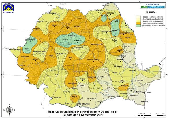 La data de 14 Septembrie 2023, conținutul de apă în stratul de sol 0-20 cm (ogor) prezintă valori scăzute (secetă pedologică moderată) și deosebit de scăzute (secetă pedologică puternică și