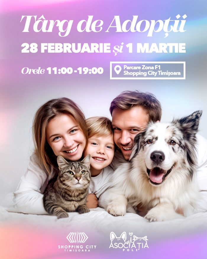 Târgul de adopții va avea loc în perioada 28 februarie – 1 martie 2026, între orele 11:00 și 19:00, în parcarea Shopping City Timișoara, zona F1. Aici vor fi disponibili pentru adopție peste 100 de câini și pisici, atât pui cât și adulți. Vizitatorii vor avea oportunitatea de a interacționa cu animalele și de a primi informații despre adoptarea responsabilă și nevoile fiecărui blănos.