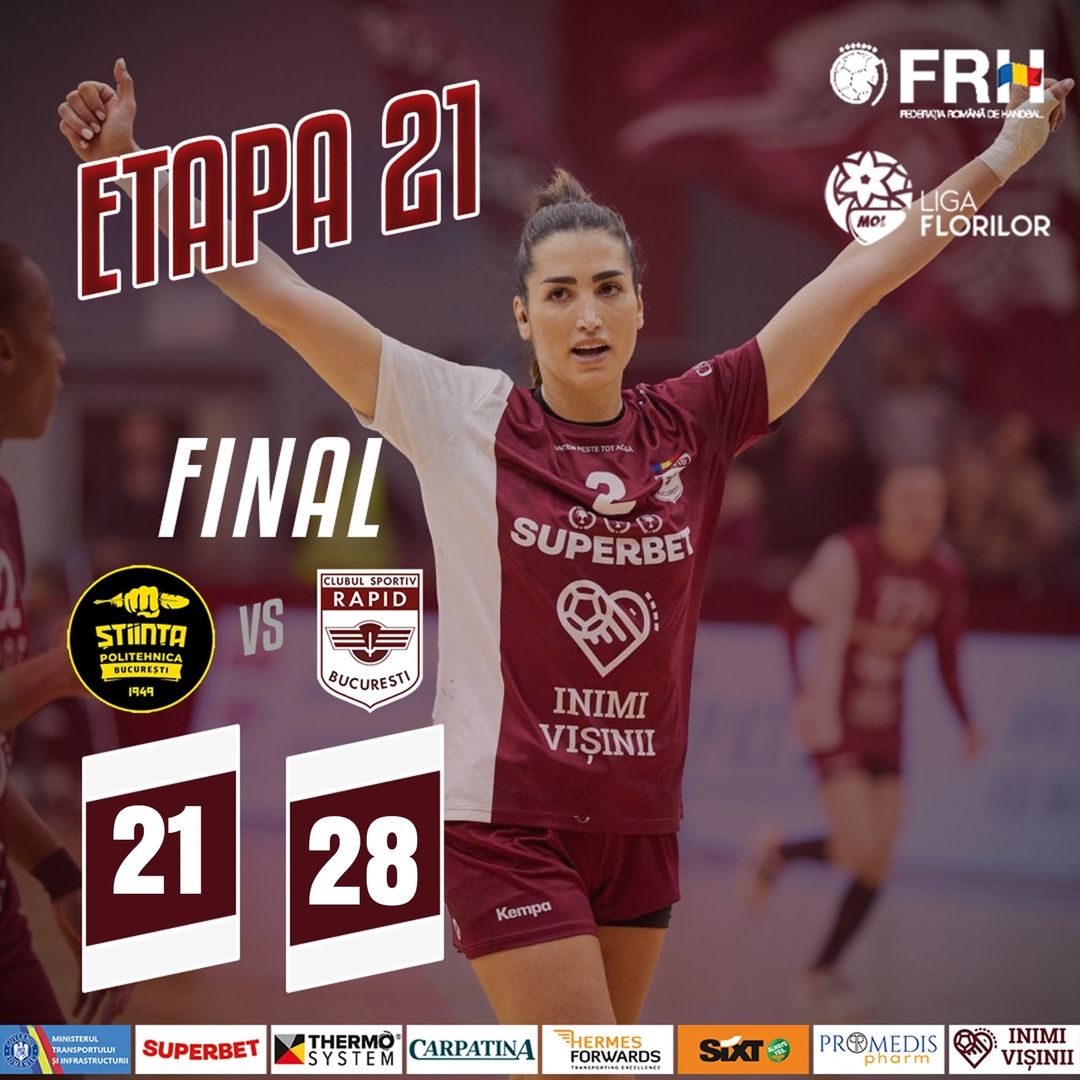 Echipa de handbal feminin Rapid București a obținut o victorie fără emoții în fața formației Știința București, într-un meci disputat în Sala Agronomia. Scorul final a fost de 28-21 în favoarea echipei Rapid.